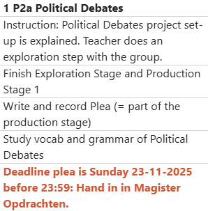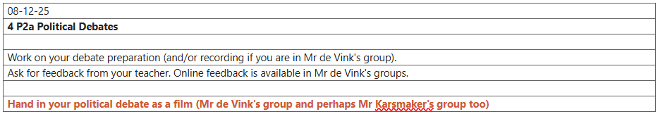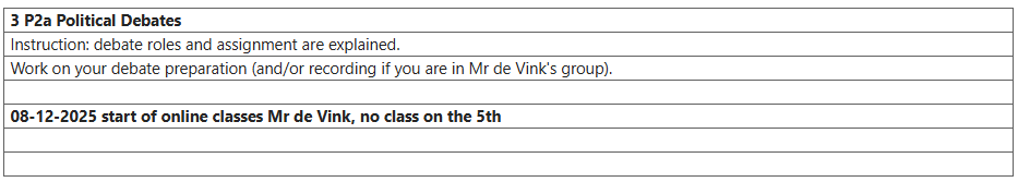 The debate will be structured in an official way and will be held in front of the class or, in Mr de Vink’s classes, online as a video.